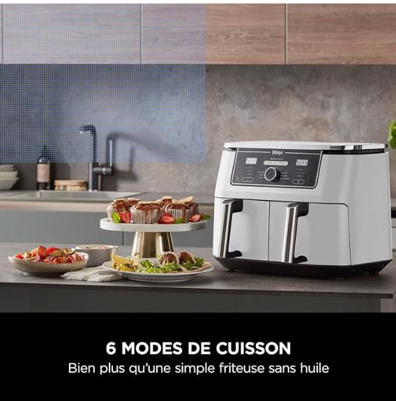 6 FONCTIONS DE CUISSON : Max Crisp, Air Fry, Rôtis, Cuit, Réchauffe, Déshydrate. Cuisinez du surgelé au croustillant. Jusqu’à 75% de matières grasses en moins* avec la fonction Air Fry (*Testé vs des frites coupées à la main et frites à la friteuse)