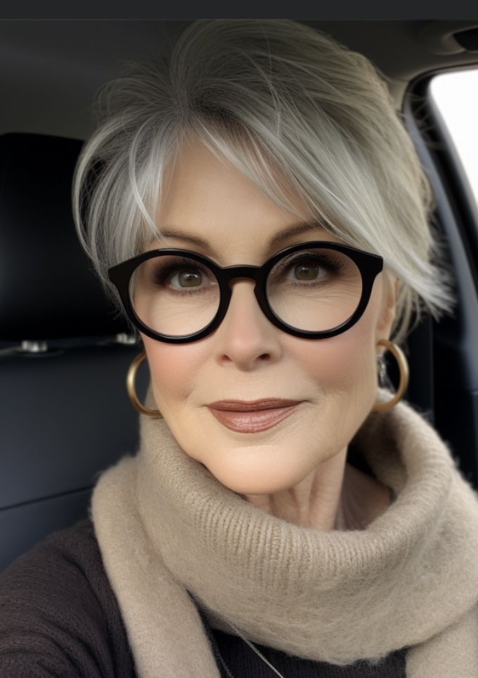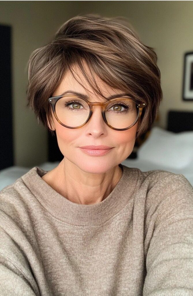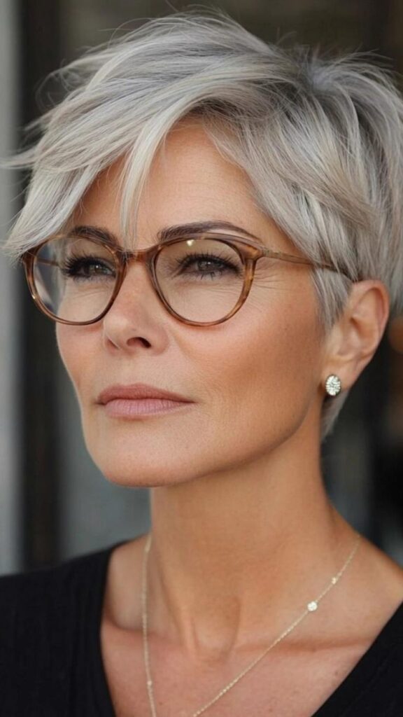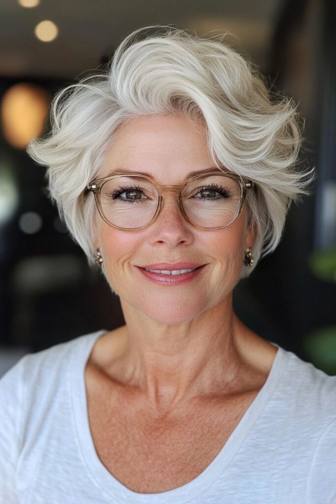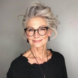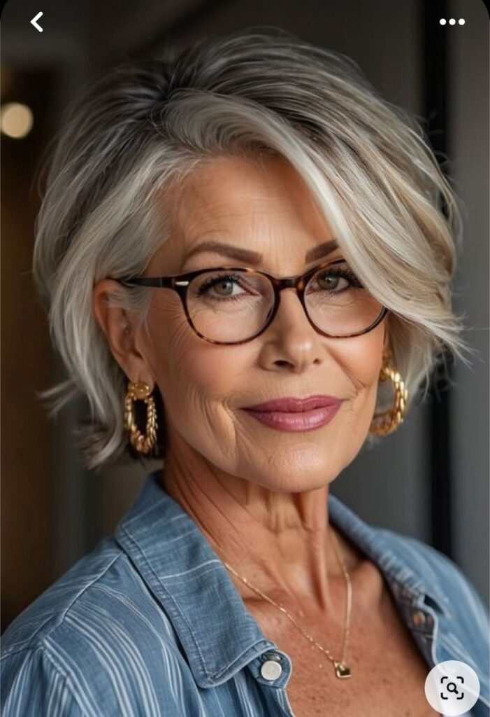 - Différentes coupes, du pixie au carré dégradé, peuvent sublimer les femmes de 60 ans portant des lunettes.